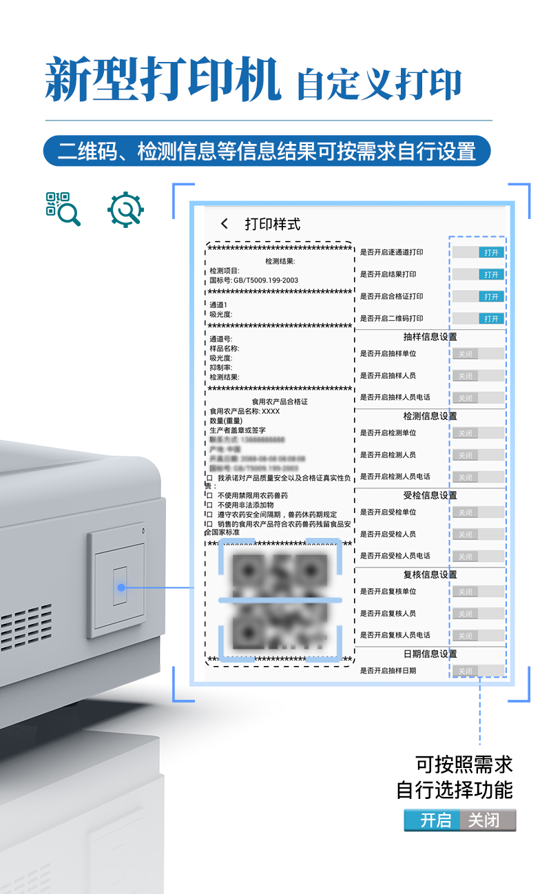 9.7.1、全新打印系統(tǒng):內(nèi)置全新打印機(jī),新創(chuàng)自定義打印方式,可按需靈活勾選控制:二維碼,抽樣信息、檢測信息,受檢信息、復(fù)核信息、抽樣日期、檢測日期等信息的打印。