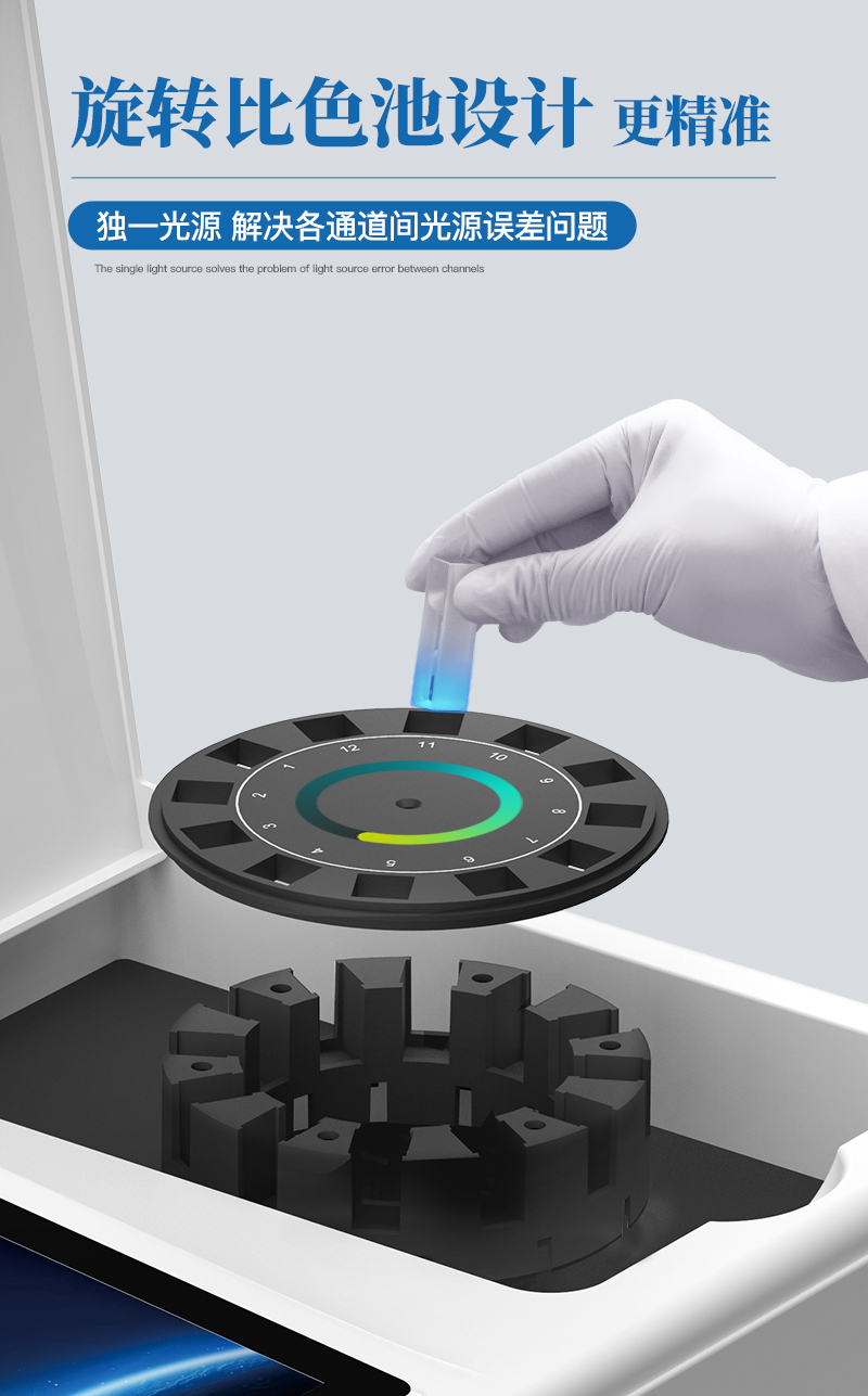 4、檢測通道:≥12通道;采用精密旋轉(zhuǎn)比色池設(shè)計,使用同芯片同光源校準(zhǔn)精度,解決不同光源之間的誤差值,更加準(zhǔn)確高效。